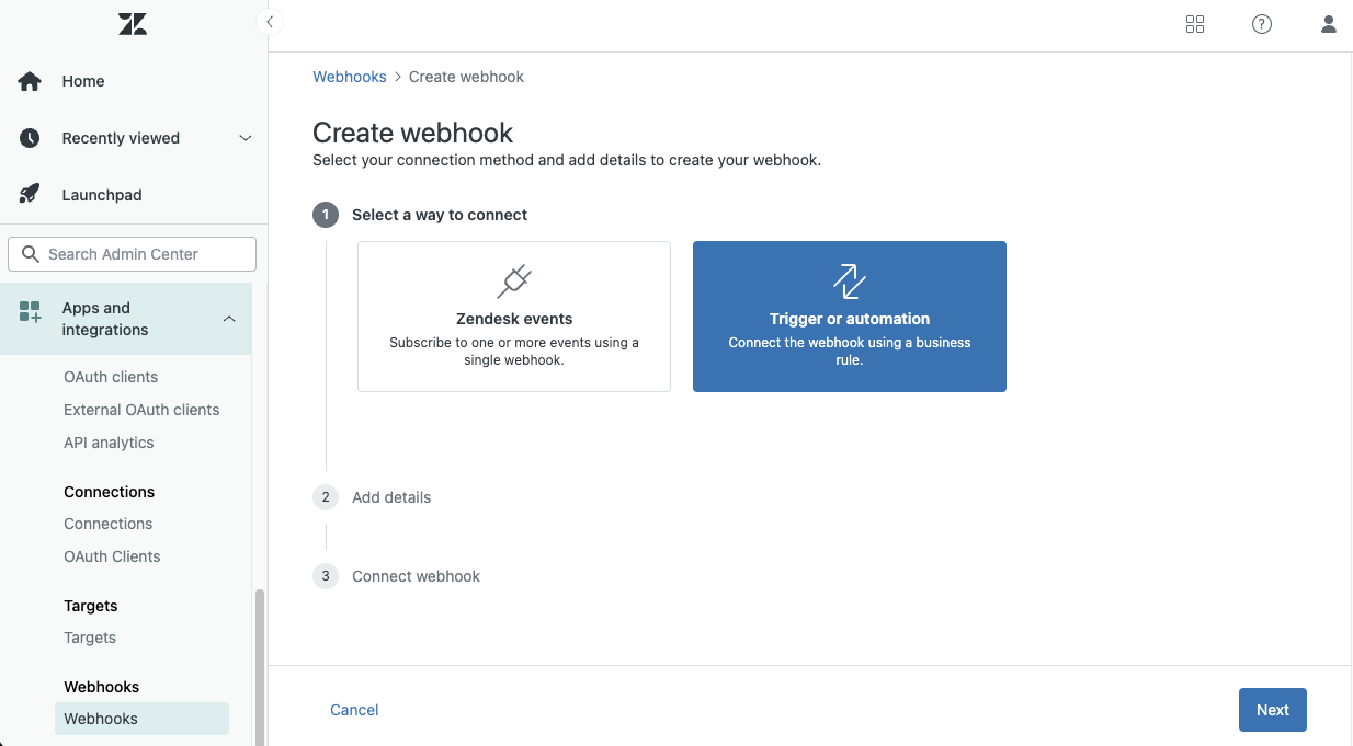 - On the Create webhook page, select Trigger or automation as the way to connect.