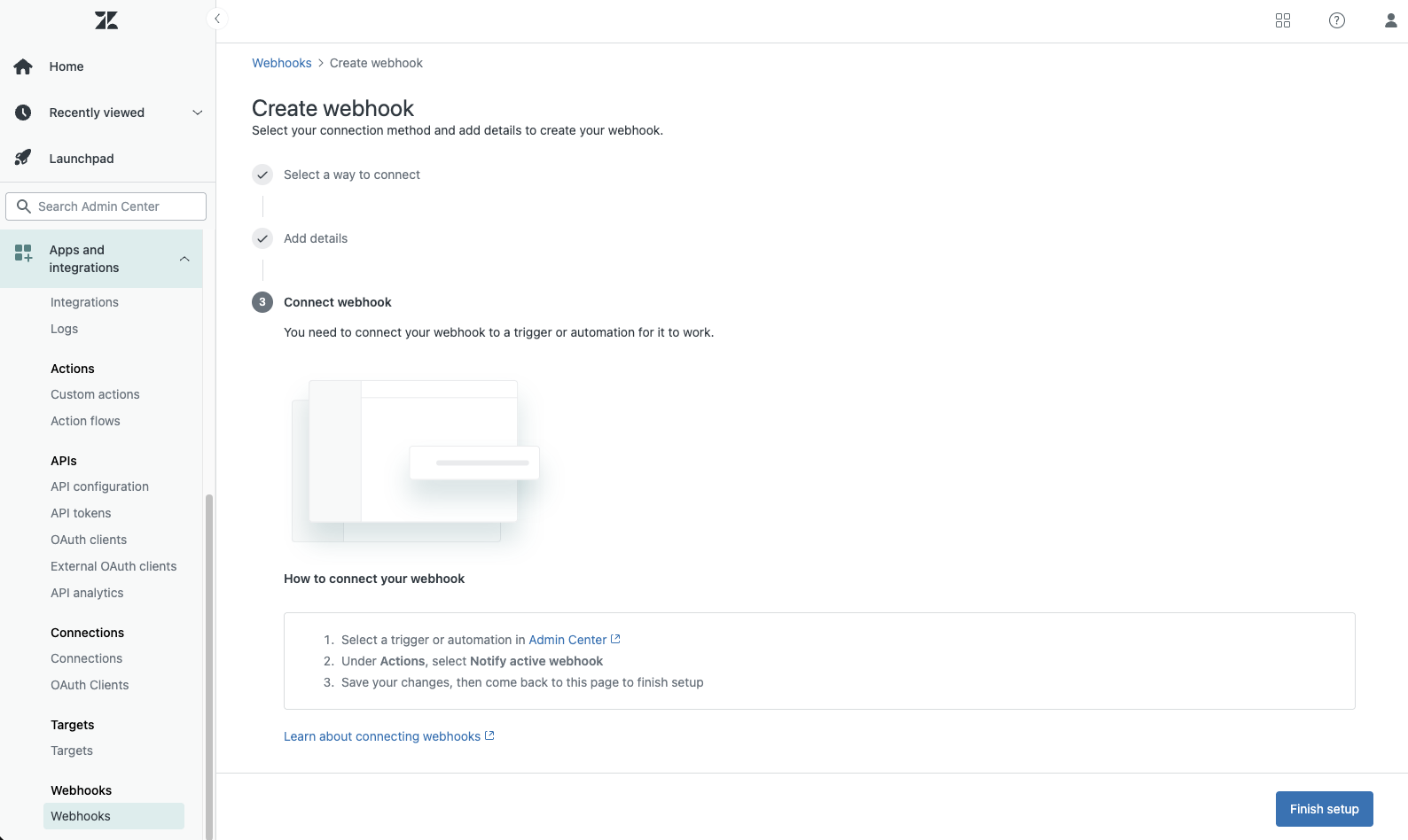 - Open the Zendesk Admin Center, expand Apps and Integrations, then select Webhooks.