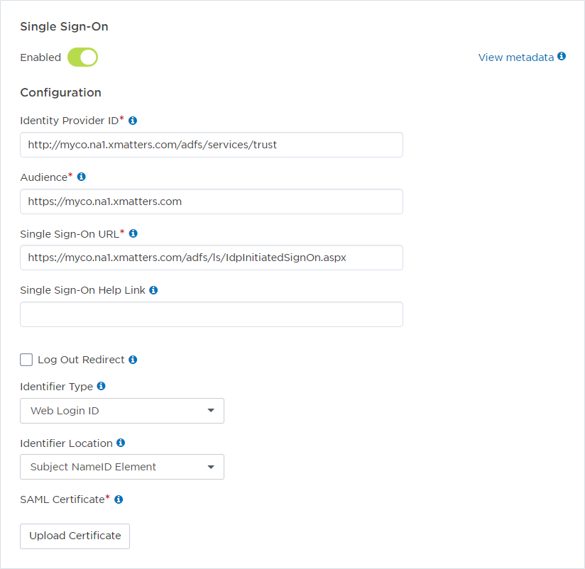 The following screenshot shows what this looks like in xMatters. Refer to the above table to see the complete text of the Identity Provider ID and Single Sign On URL fields.