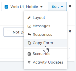 Once copied, the new form retains the same settings as the original form, however any deployment options are disabled. To deploy the form, click the drop-down list beside the form name and select the deployment options that you want to enable.